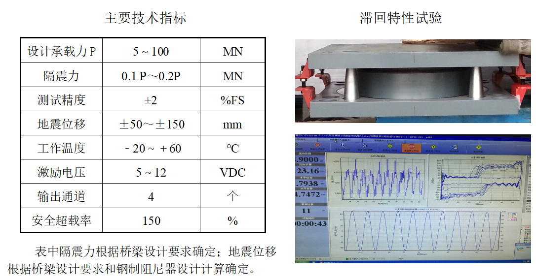 CLQZ-JG减隔震测力球型支座是一种带有钢制阻尼器并具有测力功能的减隔震球型支座。支座的隔震力由支座中多个销钉的剪切强度控制,销钉剪切强度的大小根据桥梁设计要求确定,其阻尼特性则通过非线性动力响应分析计算,确保支座运动过程阻尼力不超过支座的隔震荷载,并保证支座的地震位移量不大于钢制阻尼器的允许最大位移。支座的测力功能可用以在线监测支座的竖向荷载及其变化情况。