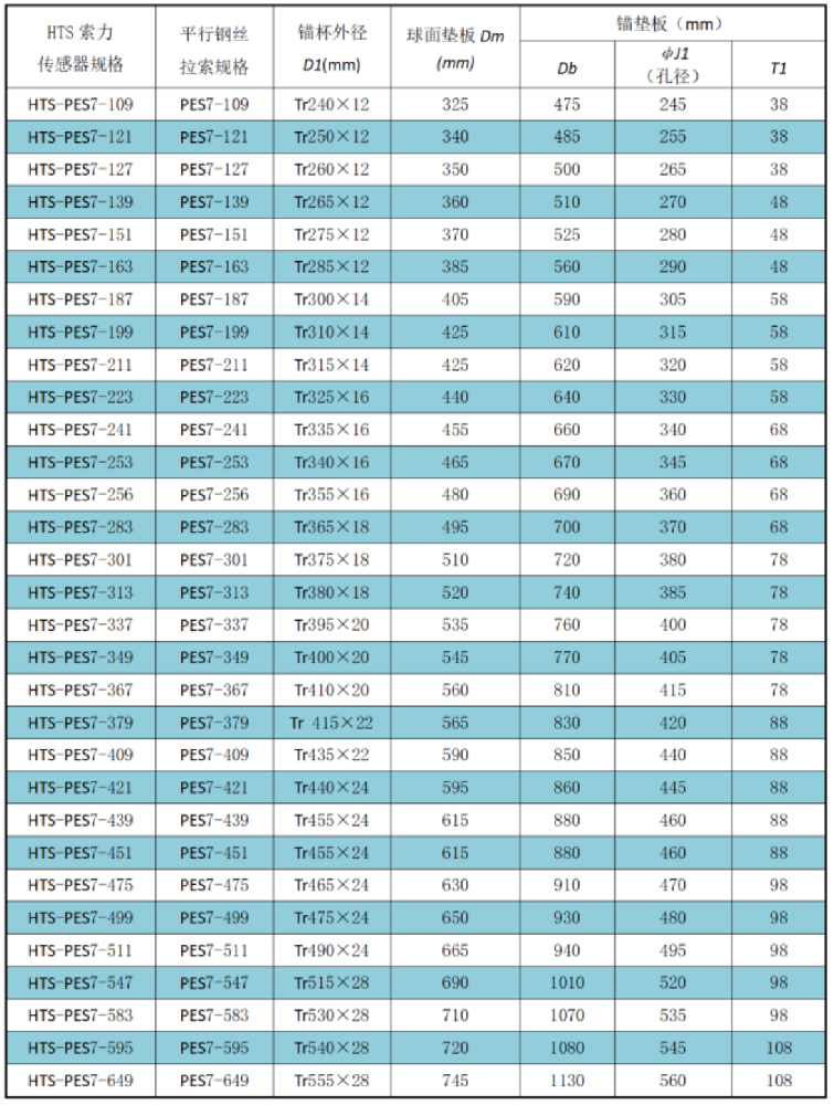 与HTS索力传感器相适配的平行钢丝拉索锚具主要尺寸参数